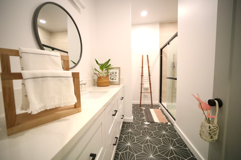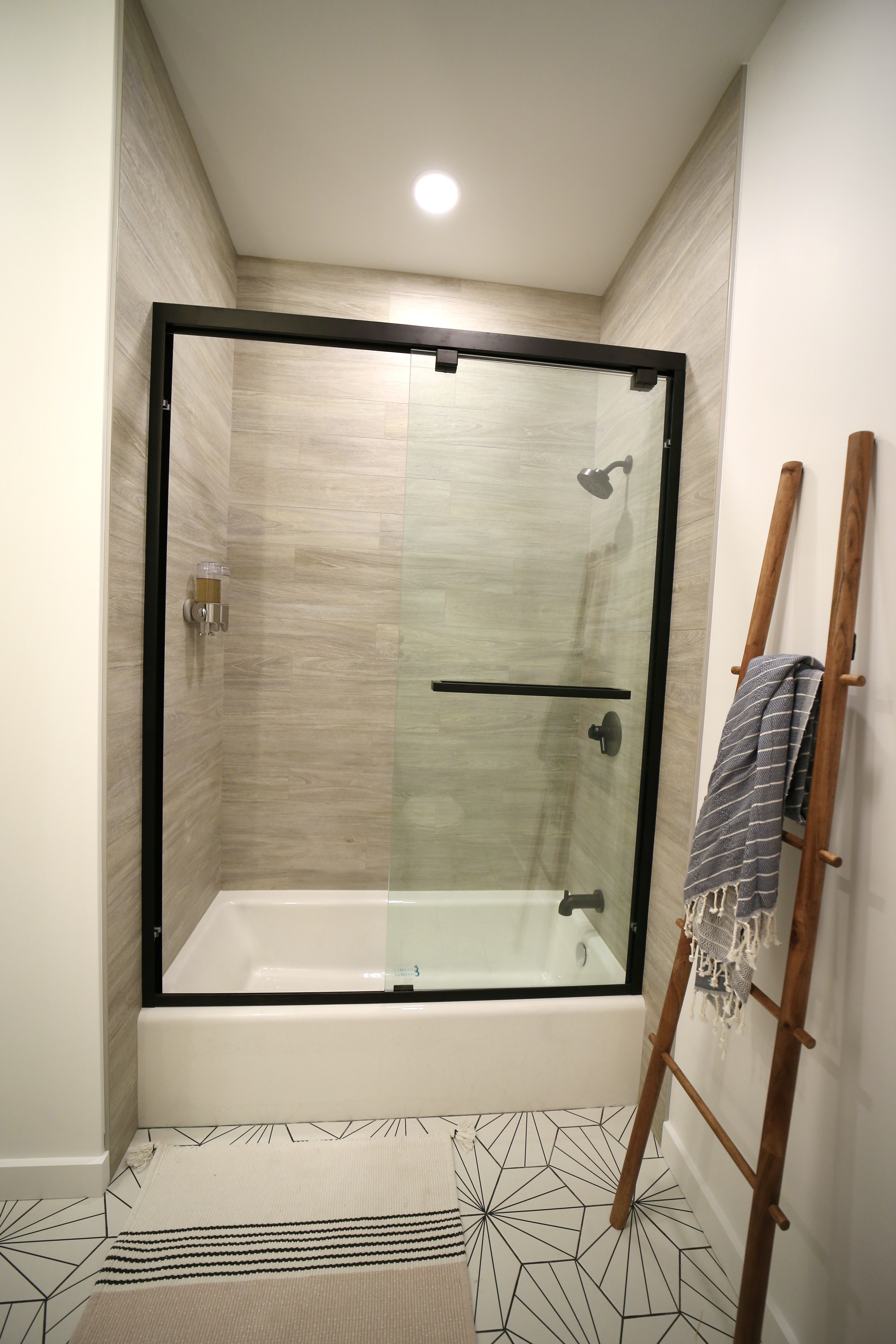 Our second bedroom is furnished with two twin xl single beds on custom white oak platforms. It also has built-in closets and a dresser as well as a desk, nightstands, and benches. Each bedroom has a separate AC and ceiling fan. The ensuite bathroom is crisp and clean with bold white tile. Our second bathroom features a porcelain tub shower.